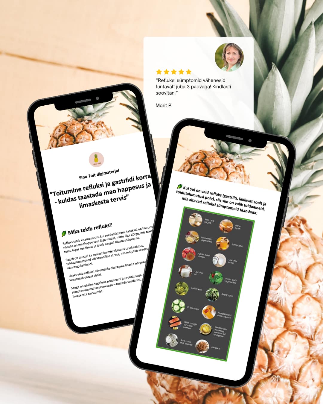 Refluksi ja gastriidi toitumisjuhend on praktiline digimaterjal, kust leiad selged põhimõtted, mida süüa ja mida vältida, et vähendada kõrvetisi, raskustunnet ja kõhuvalu. Samuti saad kaasa ühe nädala näidismenüü.